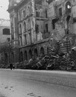 It is impossible to describe the horrible desolation of Frankfurt. Block after block of nothing but bombed ruins. London and The Hague and Prague gave one the impression of being "under control." The streets had been cleared after a fashion, and the bricks were being cleaned and stacked with an eye to re-building. The vastness of the devastation in Germany makes any such attempts seem inconsequential. It had been impossible to do more than clear a few main streets. From blasted walls, room floors were seen to sag precariously, ready to collapse under the added weight of winter rains and snows or the pressure of high winds. Yet in their shelter, people lived.