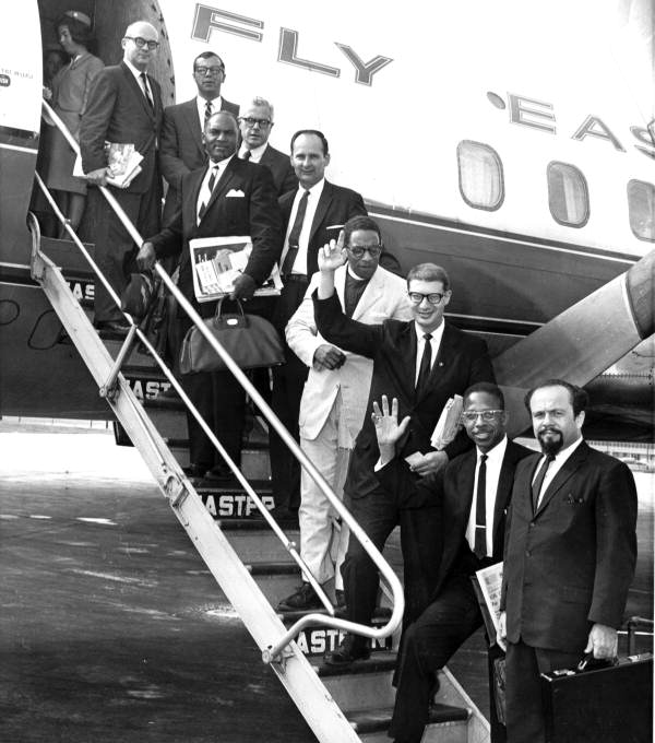 Second Photo: These white and Negro clergymen elected to go to jail on a 60-day sentence rather than pay a $500 fine each. The ministers were arrested in 1961 when they refused to obey an order to end a sit-in at the airport restaurant. In a surprise court action they were set free after spending four days in jail on a 60-day sentence. From bottom to top are Rabbi Martin Freedman from Paterson, New Jersey; Reverend John W. Collier from Newark, New Jersey; Rabbi Israel Dresner of Springfield, New Jersey; Reverend Arthur L. Hardge from New Britain, Connecticut; Reverend A. McArven Warner of New York City; Reverend Petty D. McKinney from Nyack, New York; Dr. Robert McAfee Brown of Stanford, California; Reverend Wayne Hartmire, Jr. from Culver City, California; and Reverend Robert J. Stone of New York City. August 7, 1964. Description and photo courtesy of Florida Memory Project, State Archives of Florida.